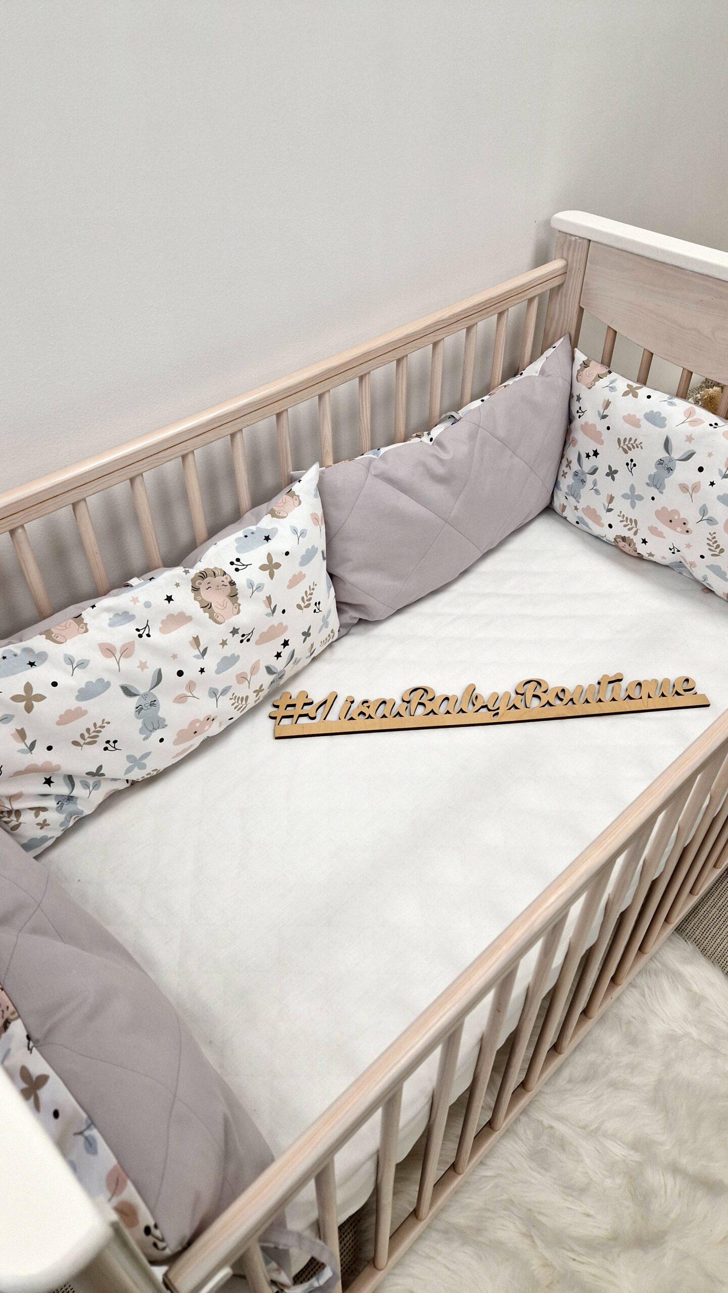 Apsaugėlių dydis 30x60cm, visai standartinei lovytei 120x60cm reikia 6vnt pagalvėlių, pusei lovytei reikia 3vnt pagalvėlių, uždengti trys lovytės šonus reikia 4vnt pagalvėlių.